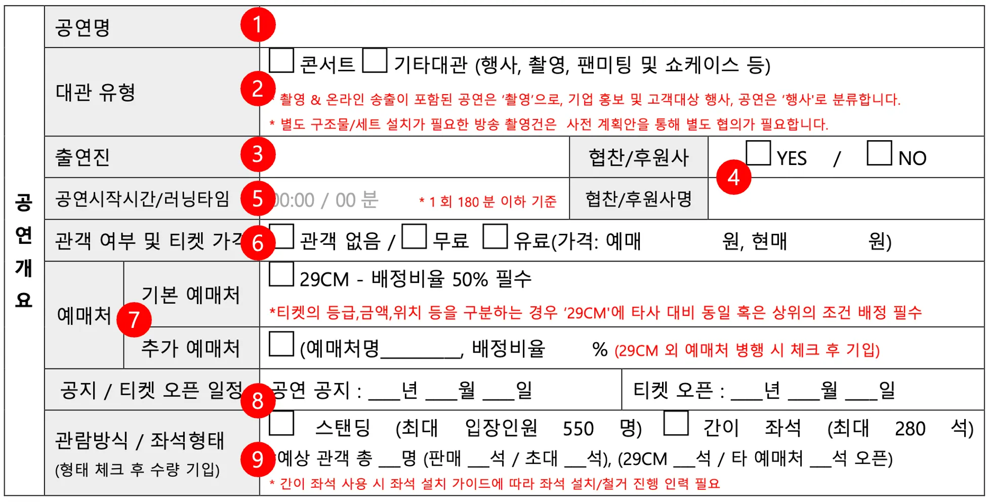 하며, 대관료는 할인된 금액인 2.콘서트 대관료(29CM 티켓 오픈 할인)이 적용됩니다. 다만, 부득이한 사유로 위 조건의 준수가 어려운 경우에는 운영사가 검토를 통해 승인한 건에 한해 대관이 가능하며 대관료는 기본 금액인 1.콘서트 대관료(기본)이 적용됩니다.