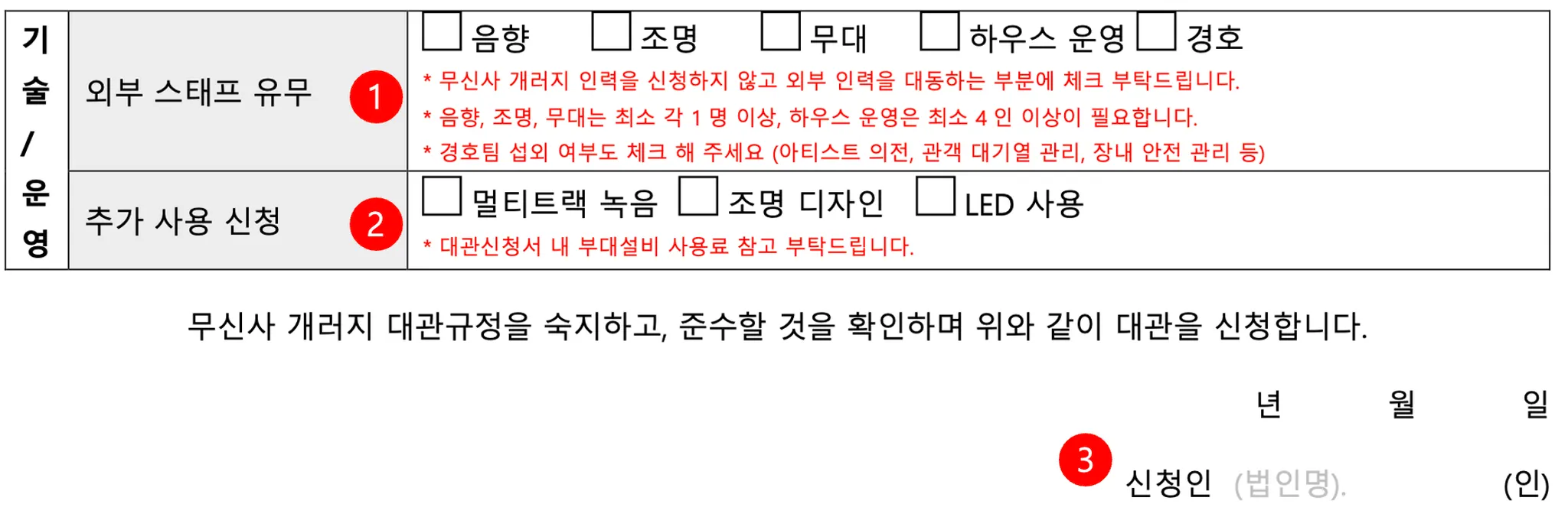 무신사개러지측에 신청하는 섭외 인력이 아닌 외부 업체 인력 및 대관 단체의 자체 인력으로 진행 시 각 파트별로 체크 해 주시면 됩니다.