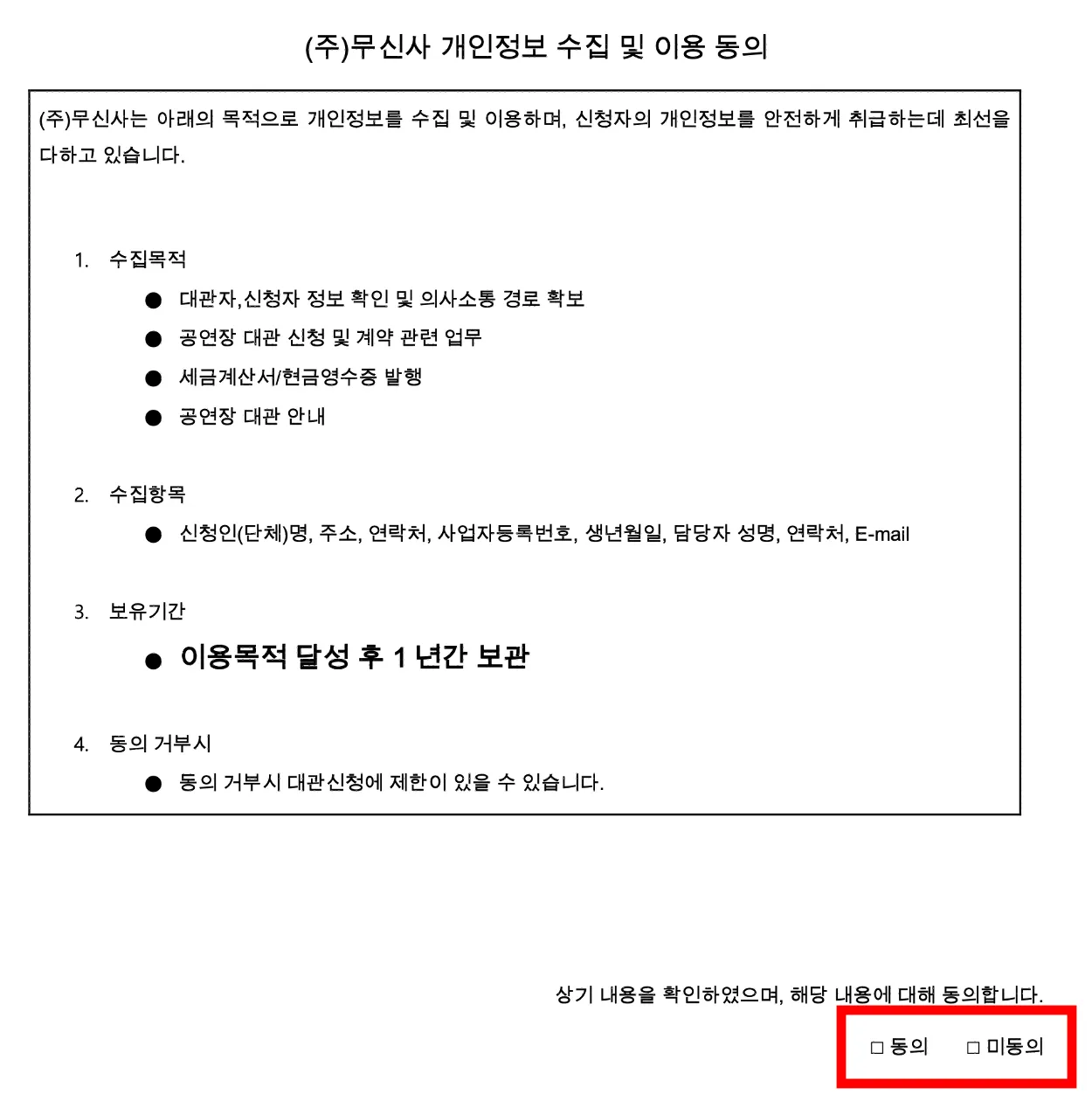 대관 신청서 및 계약서에 기재되는 개인정보 (이름, 연락처, 메일주소 등)의 수집 및 이용 동의를 체크하는 부분입니다. 대관 진행을 위해 필수적인 정보로 동의 후 대관 신청을 진행하시려면 ‘동의’에 체크 해 주시면 됩니다. (미동의 시 대관 진행에 제한이 있을 수 있습니다)